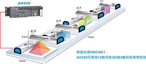 AH500的優異運動控制功能,可實現任意三軸直線補間、任意兩軸圓弧補間、及任意三軸螺旋補間與連續補間功能,透過臺達DMCNET高速通訊網絡架構,可達到1ms的指令周期內12軸同動或4組3軸同動補間功能。無論是復雜的過程控制或是精密的運動控制需求,都能透過AH500來實現,有效應用于各種產業機臺,如建材機,經編機,食品包裝機等等。