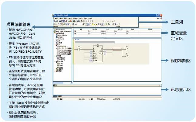 整合運動控制編輯:ISPSoft V3將邏輯編程與運動編程整合在同一套軟件上,并提供符合國際標準規格 PLCopen? 的功能塊以及臺達提供的豐富功能塊